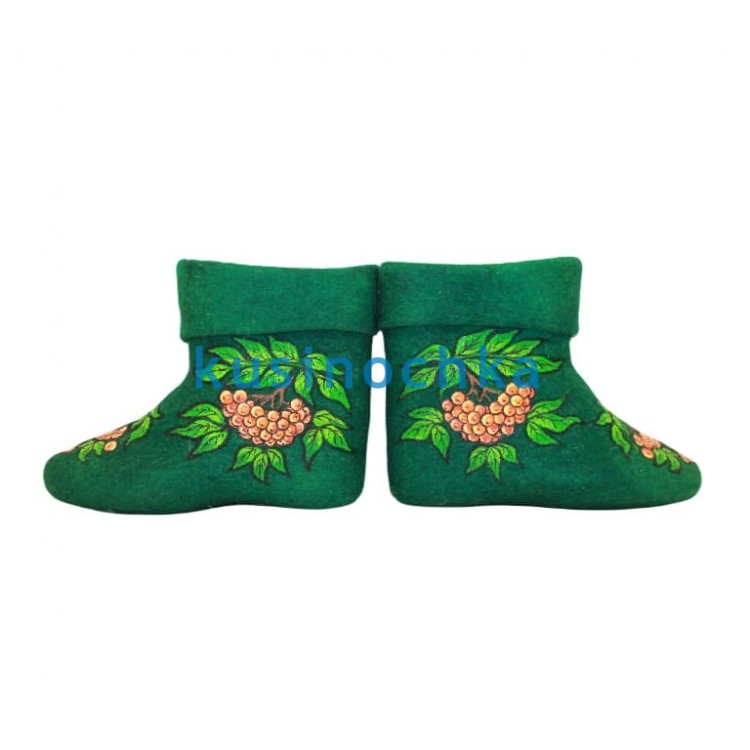 Полуваленки ручной валки на зелёной основе, с растительным узором, выполненным акриловыми красками. Композиция — стилизованные побеги, листья, изгибы стеблей, передающие движение и ритм природы. Узор не копирует конкретное растение, а создаёт ощущение живого, дышащего орнамента — адаптированного под форму укороченного валенка: компактного, но насыщенного, с акцентом на верхнюю часть и отворот.