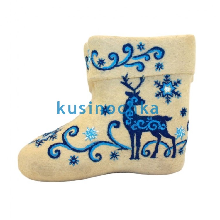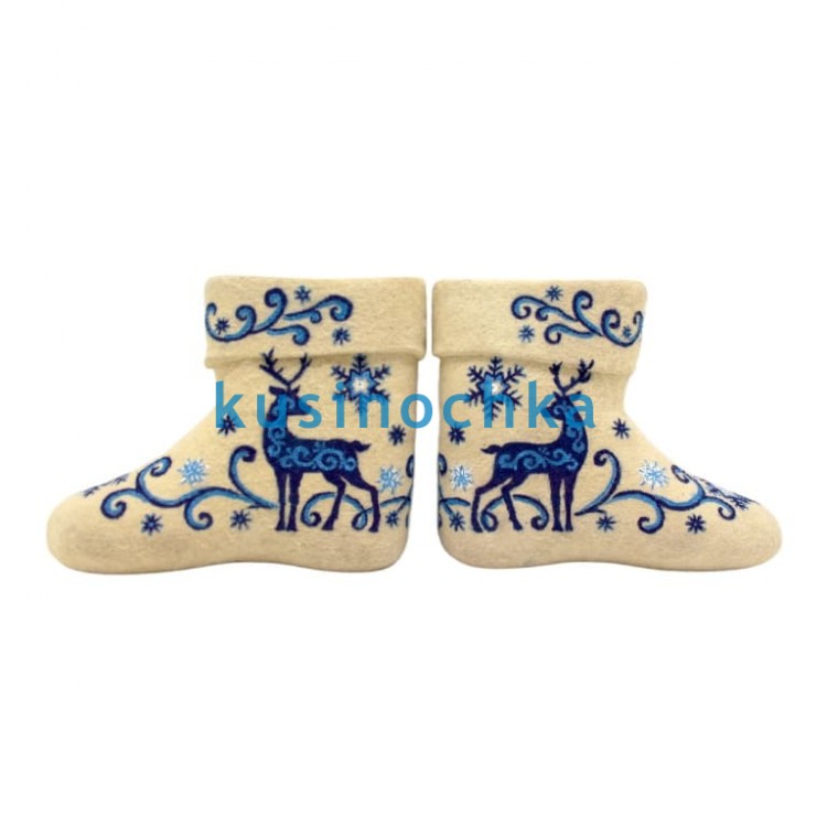 Полуваленки ручной валки на светлой основе, с декоративным узором, выполненным синей и голубой акриловыми красками. В центре композиции — олень, стилизованный, с чёткими контурами и выразительными рогами. Фоновый узор — абстрактные мотивы, напоминающие снежные завихрения, ветви или северные орнаменты, — обрамляет фигуру, не перегружая поверхность.