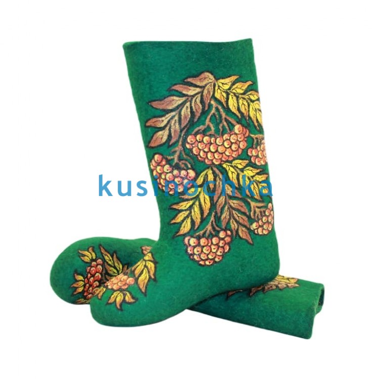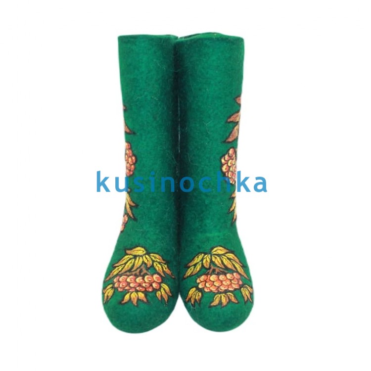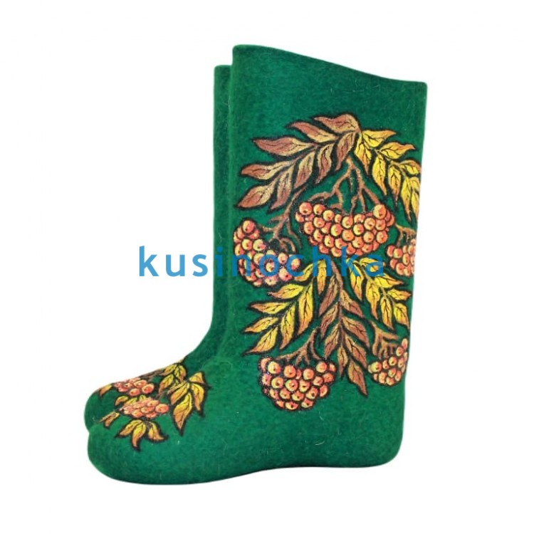 Полноразмерные валенки ручной валки на зелёной основе, с растительным узором, выполненным акриловыми красками. Композиция — стилизованные побеги, листья, изгибы стеблей, передающие движение и ритм природы. Узор не копирует конкретное растение, а создаёт ощущение живого, дышащего орнамента.