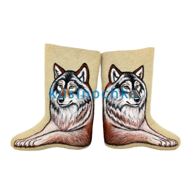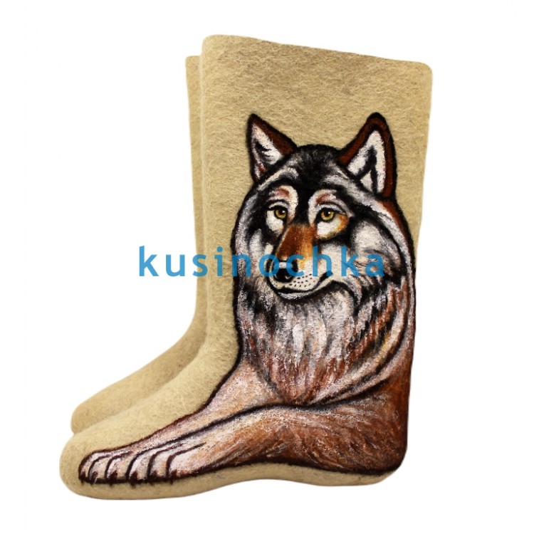 Полноразмерные валенки ручной валки на светлой основе, с художественным рисунком: сидящий волк, изображённый в фас или в три четверти. Образ стилизован — без угрозы, с выразительной, но спокойной осанкой: прямая спина, поднятая голова, внимательный взгляд. Фон минимален — акцент сделан на фигуре.