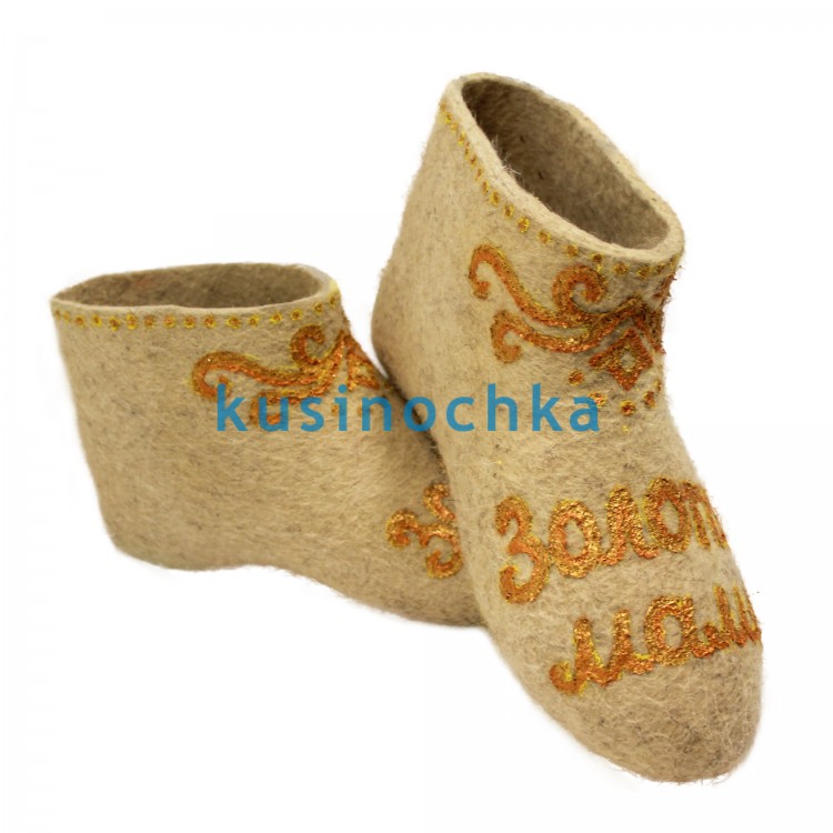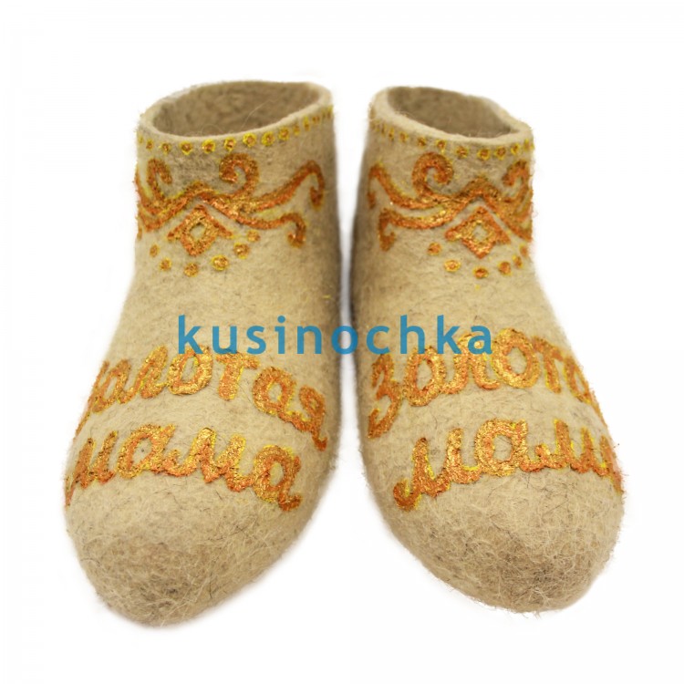 Тёплые, мягкие тапочки ручной работы из 100% натуральной овечьей шерсти — с надписью «Золотая мама», выполненной золотой акриловой краской (металлизированный пигмент, стойкий к истиранию). Идеальный подарок для мамы, бабушки или любой женщины, чья поддержка — основа семьи. Такие тапочки создают ощущение домашнего тепла даже в самую холодную зиму — благодаря природным термоизоляционным свойствам плотного войлока.